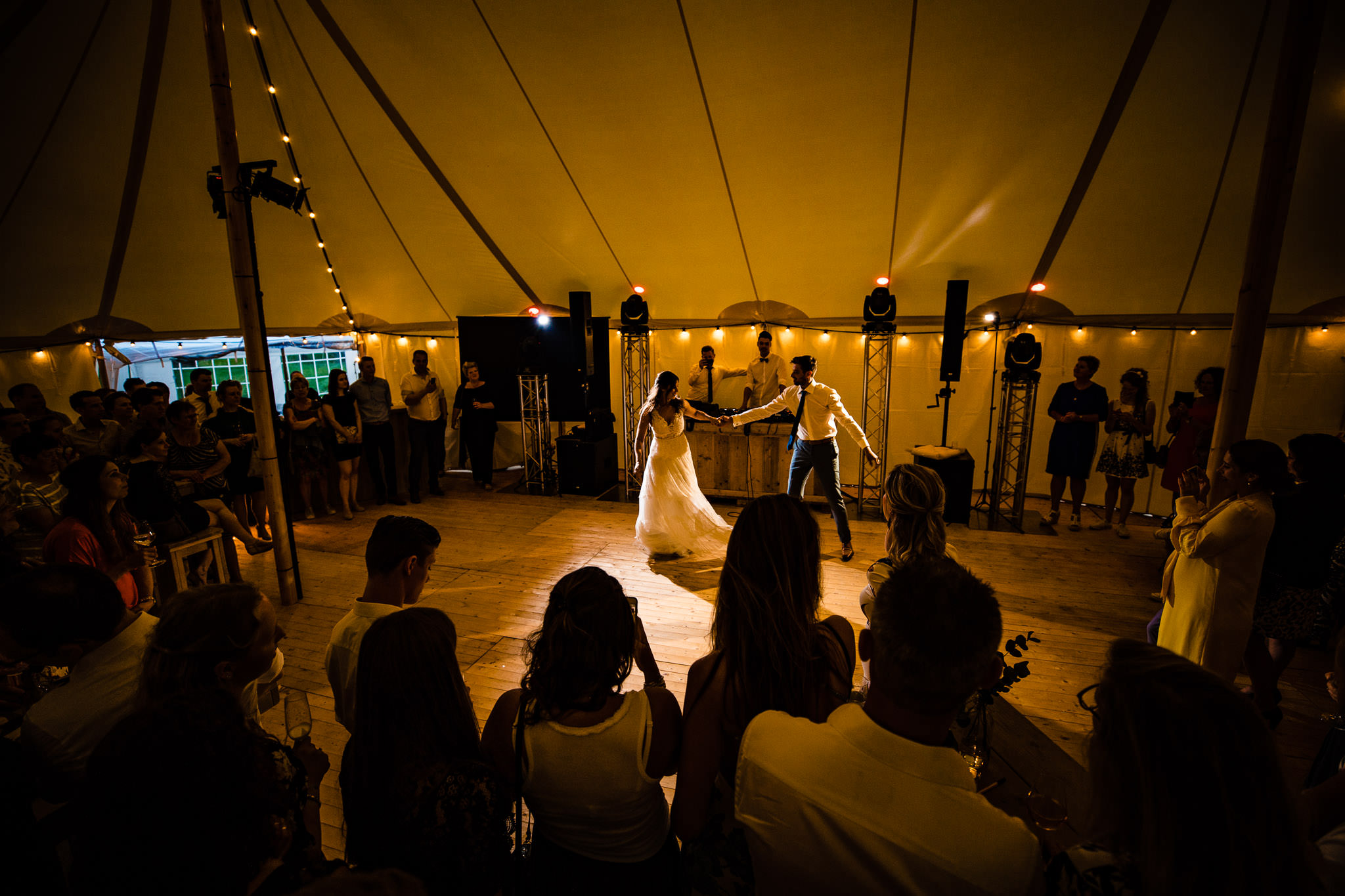 Wat een werk heeft dit bruidspaar voorafgaand aan deze dag in de bruiloft gestoken. Een heel bos voor weken lang tuinieren, een tent opzetten en de aankleding zelf maken. De bruiloft was geheel ingericht op goed weer. Met een dag vol regen zou al het werk van de afgelopen weken voor niets zijn geweest. Gelukkig voor het bruidspaar, en voor mij, kon deze dag niet beter verlopen dan dat hij heeft gedaan. Lekker zonnetje met s’avonds een flinke afkoeling om het in de feesttent dragelijk te maken. Lekker zeg! Festivalbruiloft Riethoven